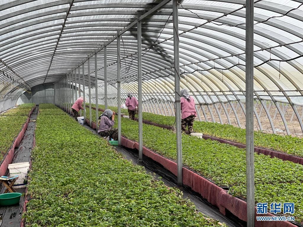 莓农在辽宁省辽阳市辽阳县刘二堡镇前杜村草莓种植基地大棚里劳作。新华社记者李恒 摄