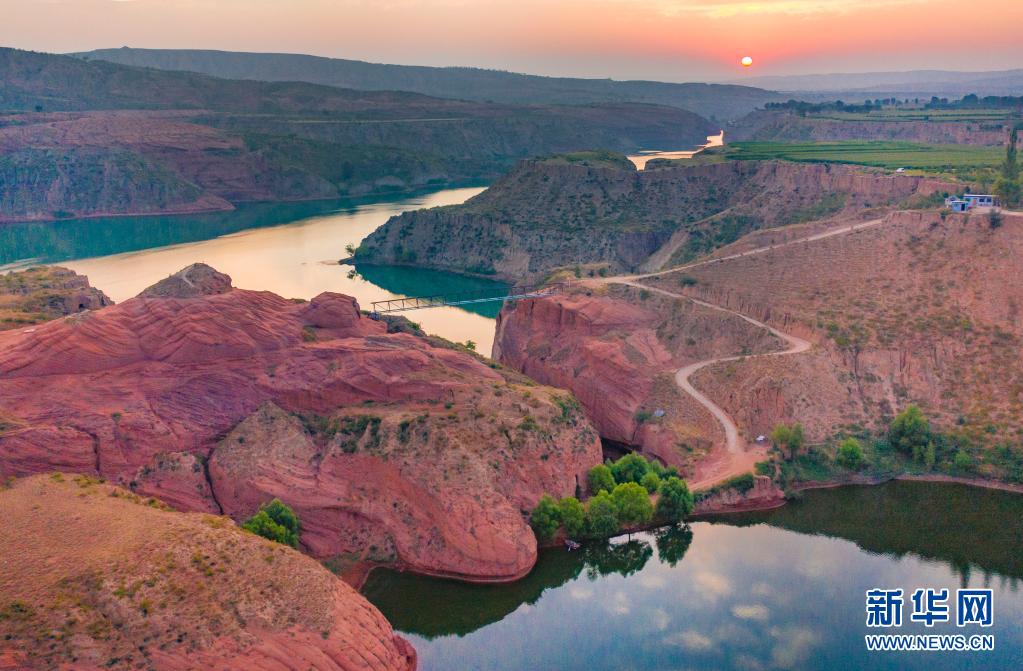 朝霞映照下的靖边县龙洲镇波浪谷丹霞景区(无人机照片)。新华社记者陶明 摄