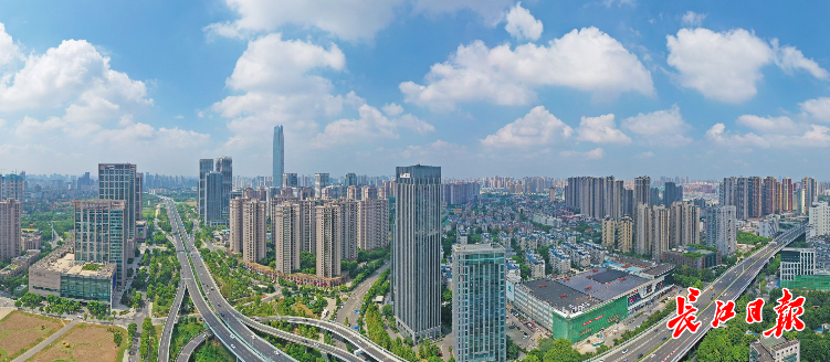 远眺武汉中央商务区,蓝天白云下高楼林立。长江日报记者詹松 摄
