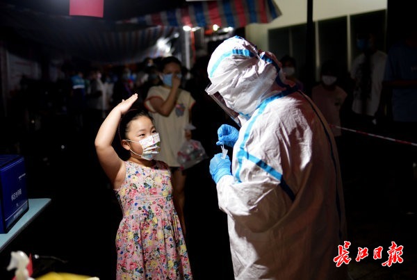 4日晚,陈翊雯向给自己做核酸检测的医生行少先队队礼,表达敬意。长江日报记者詹松 乔驰 摄