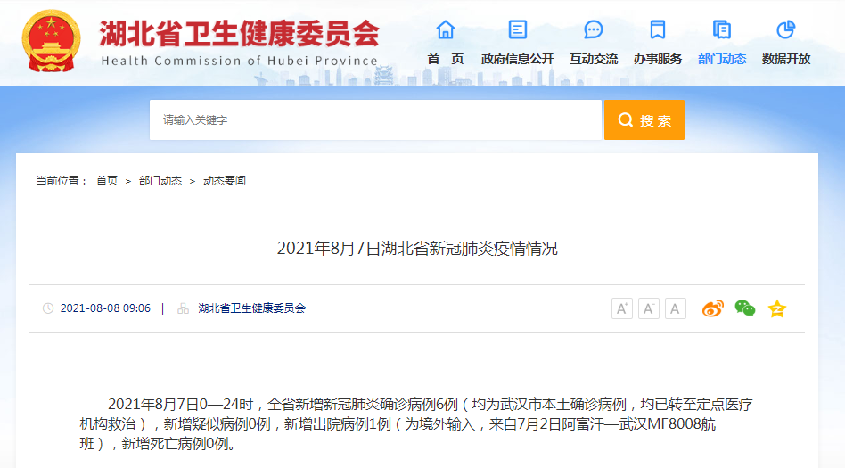 2021年8月7日0—24时,全省新增新冠肺炎确诊病例6例(均为武汉市本土确诊病例,均已转至定点医疗机构救治),新增疑似病例0例,新增出院病例1例(为境外输入,来自7月2日阿富汗—武汉MF8008航班),新增死亡病例0例。