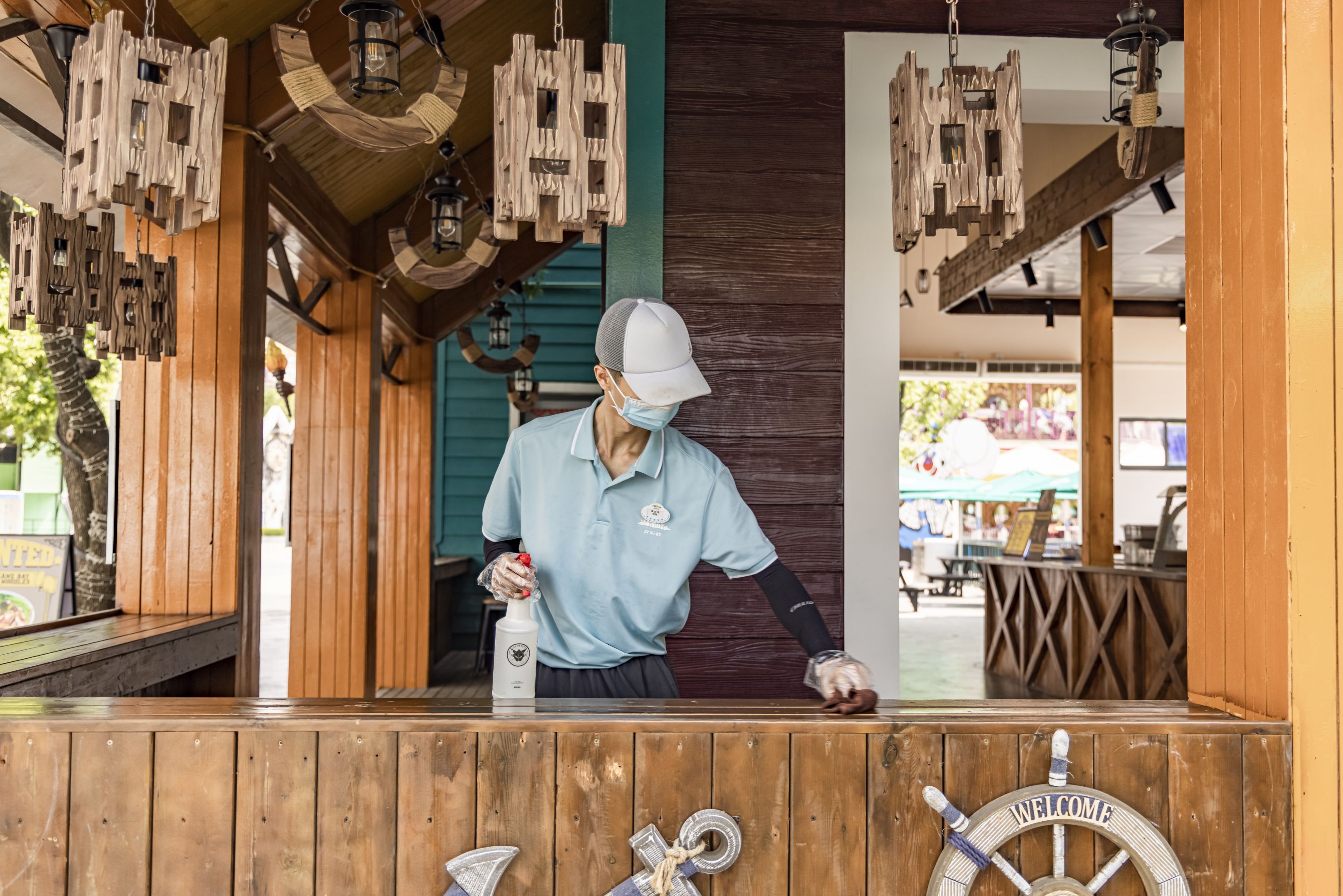 当日值守的公园管理部员工王显军早上7时便来到武汉欢乐谷,开始制定公园清洁计划,与同事们一同展开园区的防疫消毒工作。“公园虽然暂时闭园了,但我们作为公园清洁主力军,公园的清洁维护不能停,我们也计划趁着这段时间对全园做一次深度清洁、保养,以更加干净、舒爽的面貌迎来公园的再次绽放,迎接到来的每一位游客。”