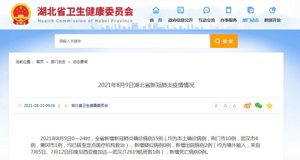 2021年8月9日0—24时,全省新增新冠肺炎确诊病例15例(均为本土确诊病例,荆门市10例,武汉市4例,黄冈市1例,均已转至定点医疗机构救治),新增疑似病例0例,新增出院病例2例(均为境外输入,来自7月5日、7月12日印度尼西亚雅加达—武汉JT2619航班各1例),新增死亡病例0例。