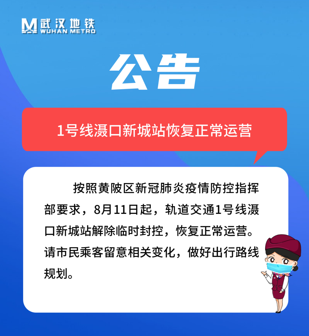 8月10日晚,记者从“武汉地铁运营”官方微博获悉,8月11日起,轨道交通1号线滠口新城站解除临时管控,恢复正常运营。