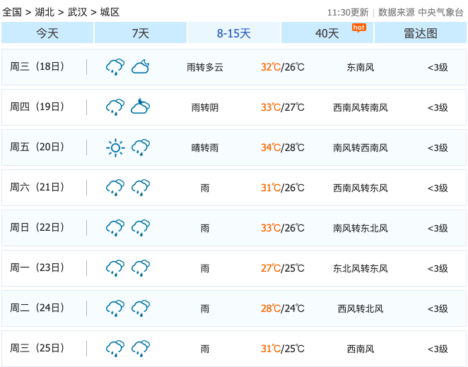 这两天雨中的武汉,大街上有人已经穿上长裤、长袖。根据中央气象台发布的7日预报,未来一周,雨雨雨是武汉天气的“主旋律”,最高气温最低可能会降到24℃左右,最低气温最低可能会降到22℃左右。今年,武汉人应该可以过个相对凉爽的末伏。