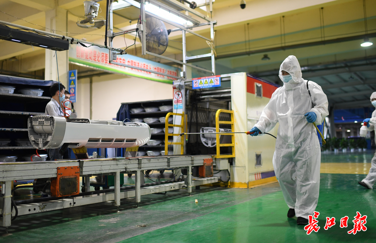 武汉格力总装工厂工作人员对厂区内的生产车间及公共区域每天不少于3次消杀。长江日报记者周超 通讯员伍思梦 摄