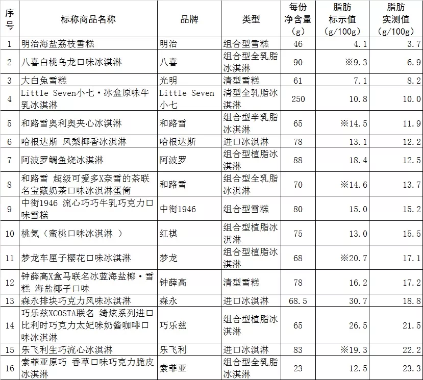 测试中,16款样品的脂肪含量实测值为每100克3.7克至23.3克。其中脂肪含量最高的是标称为“索菲亚原巧 香草口味巧克力脆皮冰淇淋”的产品;紧接着是标称为“乐飞利生巧流心冰淇淋”的样品,脂肪实测值为22.2克/100克;排名第三的是标称为“巧乐兹╳COSTA联名,绮炫系列进口比利时巧克力太妃味奶浆咖啡口味冰淇淋”,实测值为21.5克/100克。