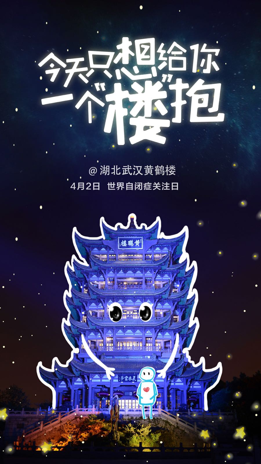 黄鹤楼公园管理处相关负责人介绍,自2015年开始,每年4月2日,黄鹤楼公园和其他省市的中国历史文化名楼都会在线下共同举办点亮蓝灯活动,今年因情况特殊,特别策划采取创意海报和线上联动的方式,传递一份不变的温暖。“在今年的海报上,黄鹤楼化身成温暖的人物形象,伸出双臂,拥抱代表自闭症儿童的‘小蓝人’。”
