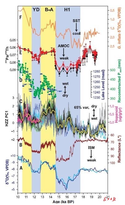 谢树成教授团队以鄂西的石笋记录和泥炭微生物记录为依托,综合海洋沉积物和湖泊沉积物记录,并结合古气候数值模拟,发现我国东部地区在末次冰消期存在干湿古气候的三极模态变化,即长江中游地区与华南、华北存在明显差异:当东亚夏季风较弱时,长江中游相对湿润,而华南和华北则正好相反。论文进一步提出,东部地区干湿古气候的这种空间变化主要受控于古季风与古西风的相互作用,这项研究凸显出长江中游在古气候研究上的重要地位。