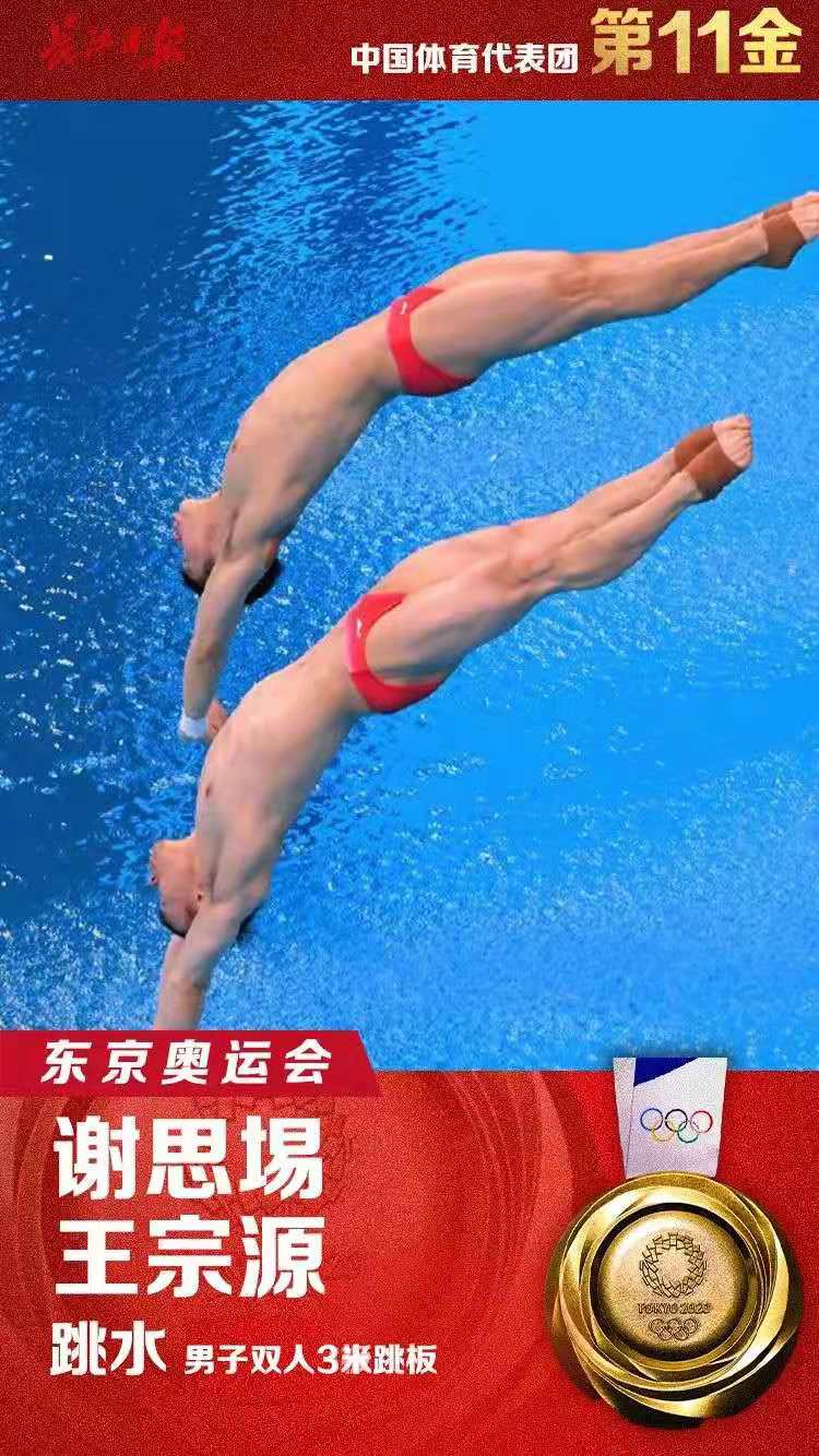 7月28日,武汉体育学院2020级本科生王宗源搭档谢思埸,以总成绩467.82分摘得跳水男子双人3米板金牌,为中国队摘得第11金,也是湖北选手在本届奥运会中获得的首枚金牌。