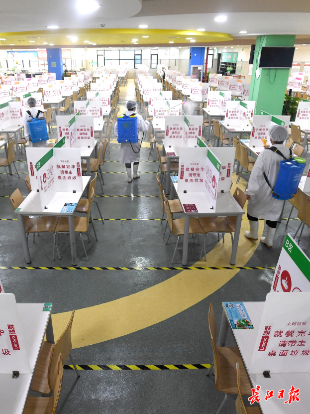 联想(武汉)产业基地食堂区域进行喷洒酒精消杀。长江日报记者周超 通讯员 何璇 摄