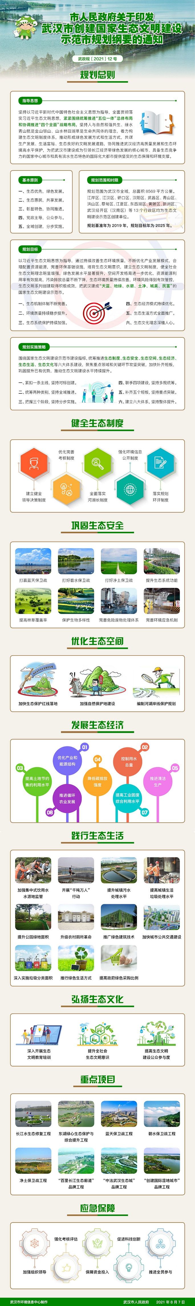 8月11日,《武汉市创建国家生态文明建设示范市规划纲要》在武汉市政府官网公布。规划提出,到2025年把武汉建成“天蓝、地绿、水碧、土净、城美、民富”的国家生态文明建设示范市。