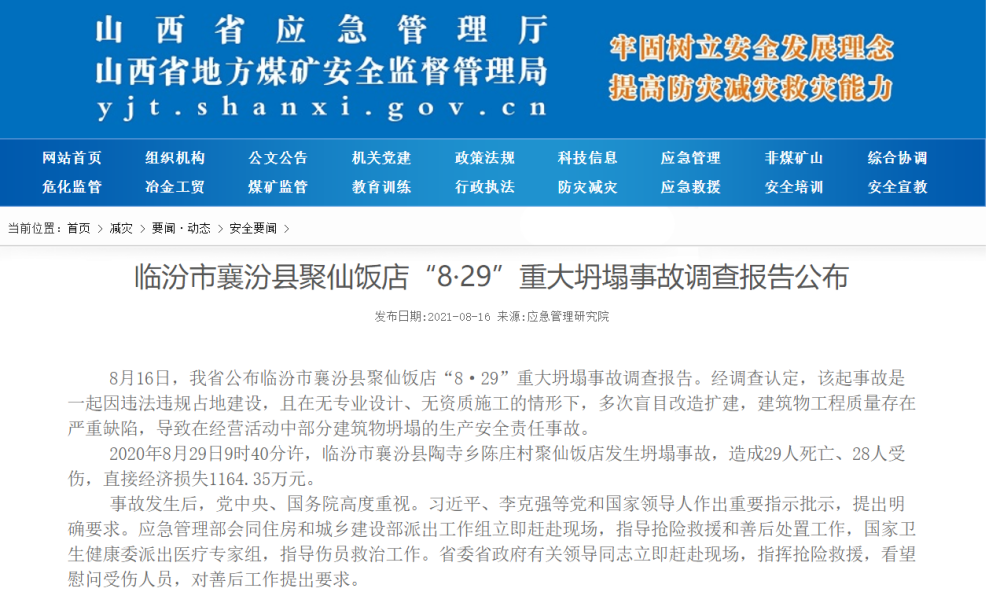 8月16日,山西省公布了临汾市襄汾县聚仙饭店“8·29”重大坍塌事故调查报告。经调查,事故的直接原因是聚仙饭店建筑结构整体性差,经多次违规加建后,承重砖柱及北楼二层屋面荷载严重超载,同时不排除强降雨影响,最终导致整体坍塌。 对聚仙饭店经营者,公安机关依法采取刑事强制措施,并对聚仙饭店处以罚款,责令其退还非法占用的土地,限期拆除在非法占用的土地上建设的房屋;对事故涉及的41名有关公职人员,给予了党纪政务处分或诫勉、批评教育、责令检查等处理措施。