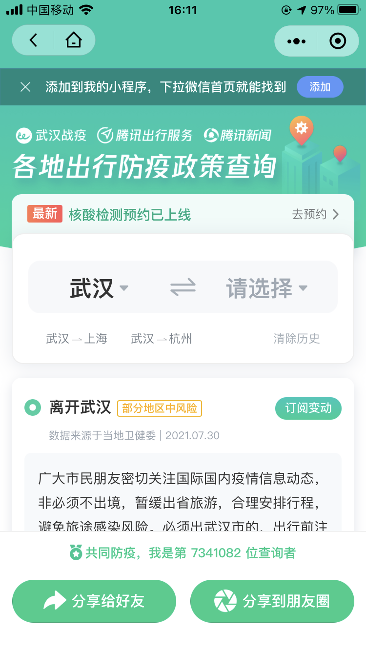 “武汉战疫”小程序由武汉市政务服务和大数据管理局打造,今年初,“武汉战疫”小程序在疫情防控专区新增“全国疫情地区风险等级查询”“各地出行防疫政策查询”等服务功能,市民点开“武汉战疫”小程序,输入“出发地”和“目的地”,即刻就能查询全国中高风险地区、各地出行防疫政策、全国疫情地图等信息,为市民出行提供参考。