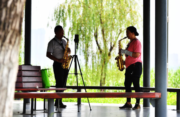 8月18日早晨,在汉口江滩, 两位市民在练习萨克斯。 长江日报记者 喻志勇 摄