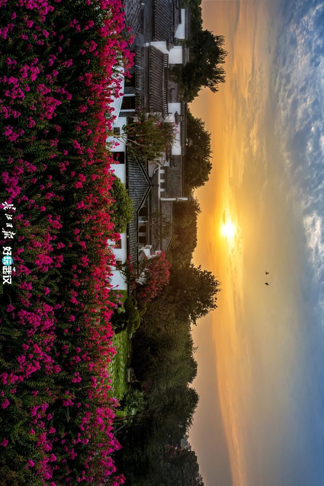 ■ 新洲紫薇都市田园,起个大早拍日出,朝阳映照天边,红色的紫薇花开正艳,黛瓦白墙下,朝霞映花别样红。