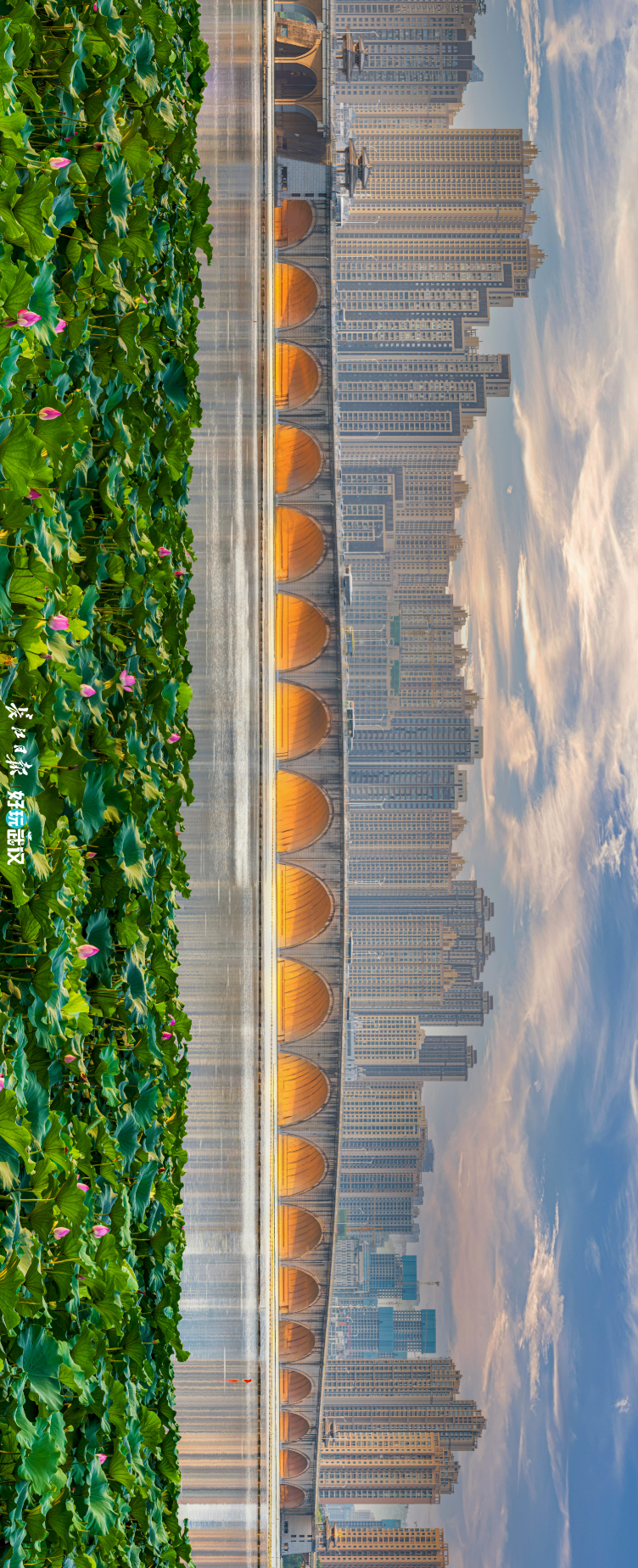 7月19日18时左右,我在墨水湖大桥也拍到了“金光穿洞”的景象。为了让前景的荷花、中景的大桥、远景的高楼和天空都清晰可见,我拍摄了多张照片,后期通过景深合成、接片等方法,完美呈现出这幅作品,令人惊喜。