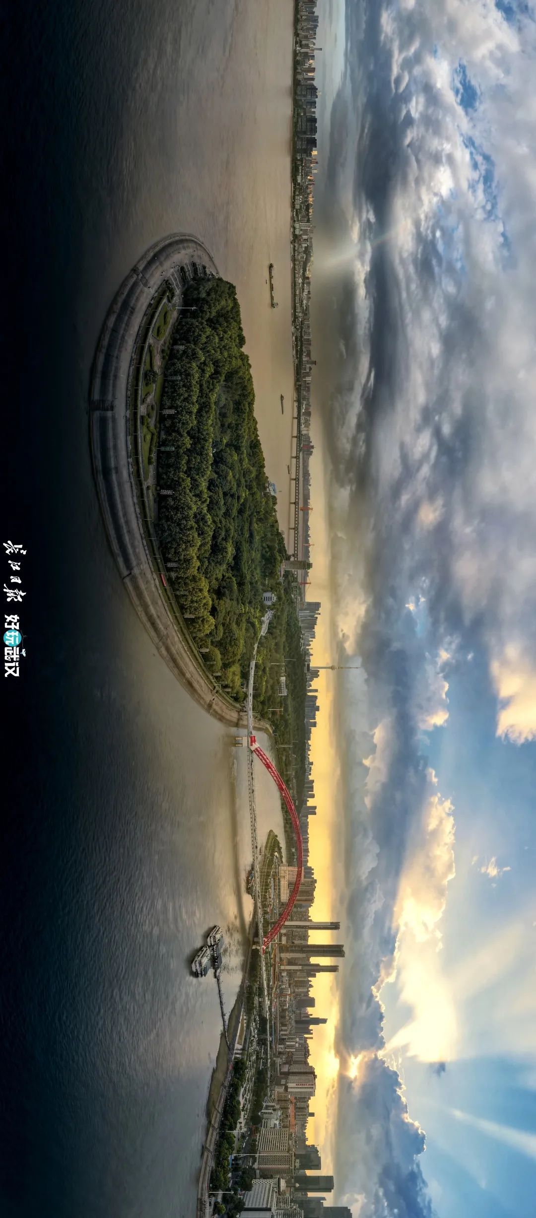 ■ 这是在长江南岸嘴上空,我用无人机全景画幅一次成像拍摄的奇幻天象,东边,小雨中出现了一道彩虹,西边,日落余晖透过厚厚的云层,呈现“丁达尔效应”。