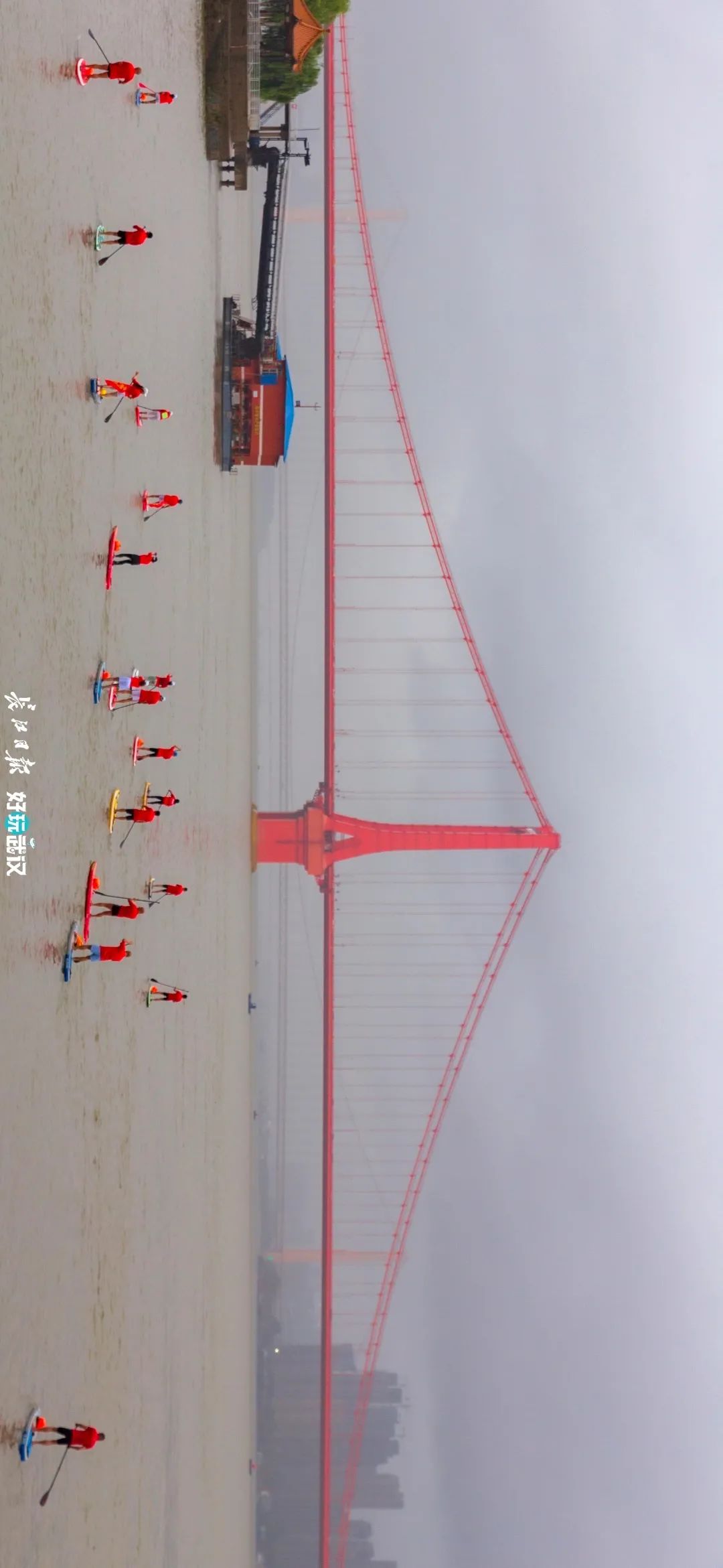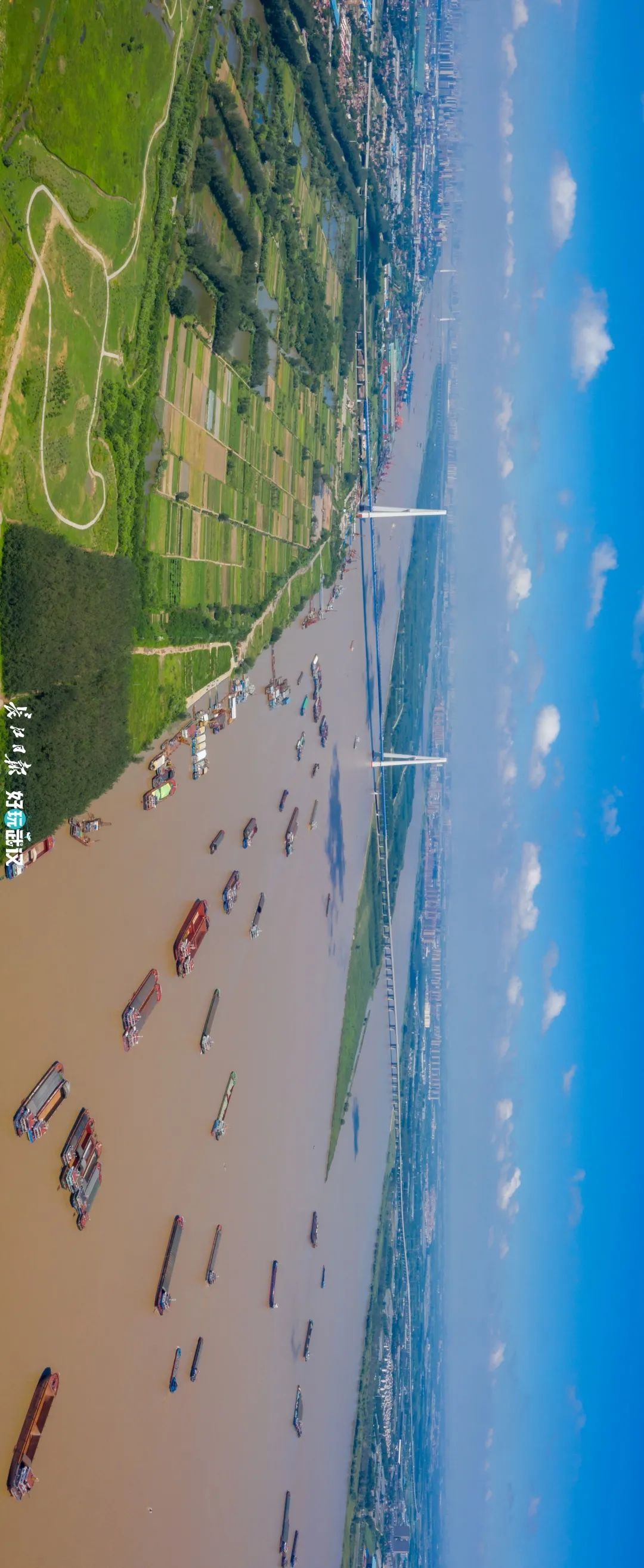 ■ 天兴洲将宽阔的江面一分为二,画面左边是宝武集团武汉工业港,江面上一艘艘货轮频繁地进港出港,一派“百舸争流”的繁忙景象。近处的大桥是正在建设中的青山长江大桥,远一点的则是天兴洲长江大桥。