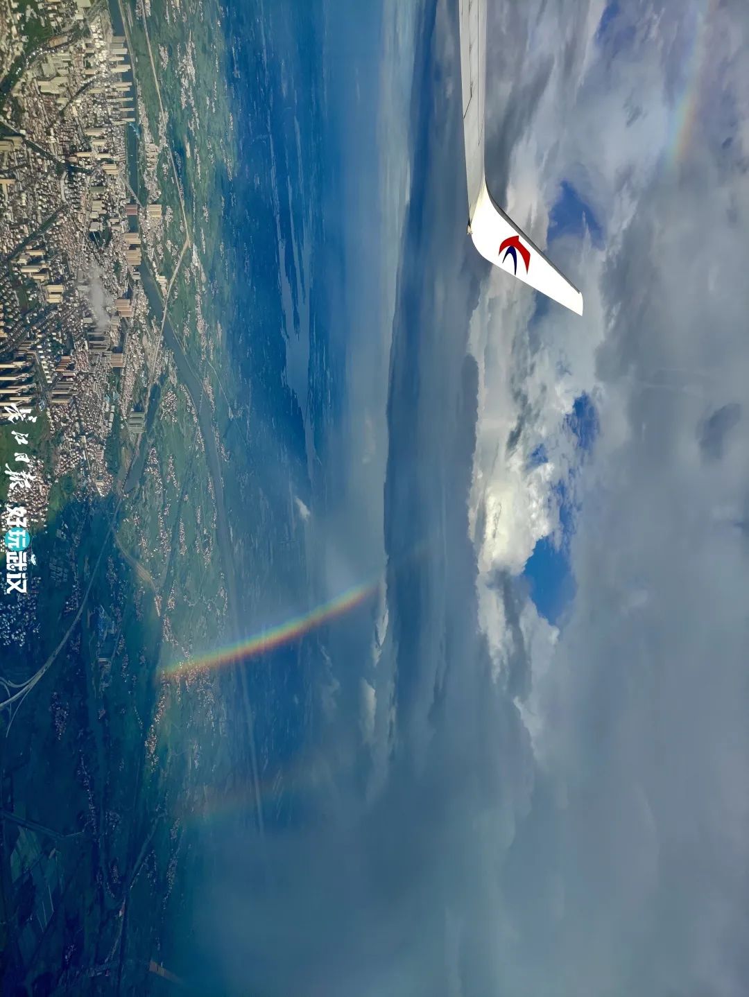 ■ 7月27日傍晚,一架刚刚起航的飞机,在黄陂上空遇到了双彩虹。机翼、彩虹在高空中同框,远处的云层也是在地面看不到的景象,真浪漫。
