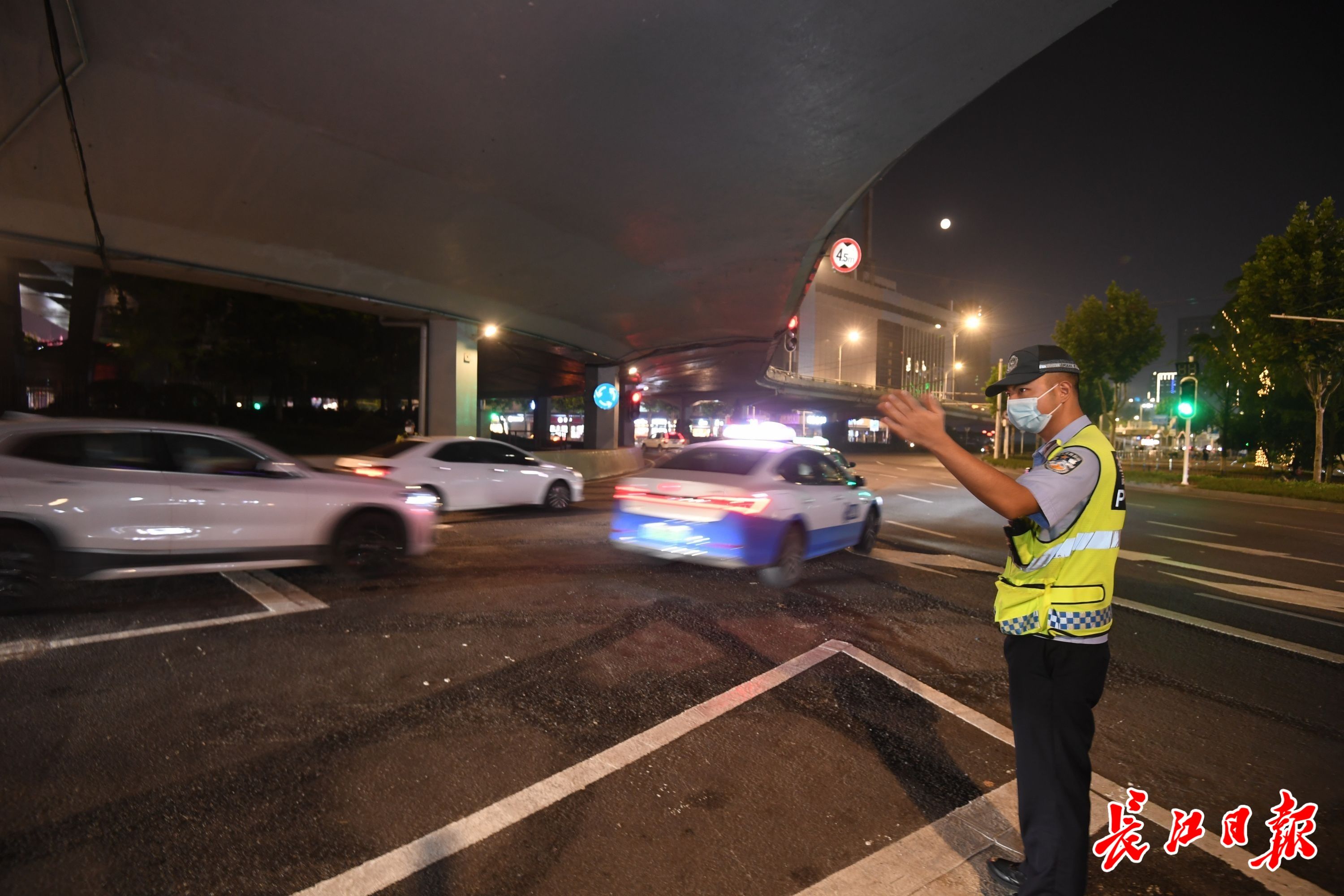 21日晚,民警在观测车流引导车辆。记者史伟 摄