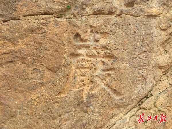 汉阳凤凰山摩崖石刻“岩”字石刻,和“端平丙申”“汉阳令赵时题”小字题记石刻。 长江日报记者万建辉 摄