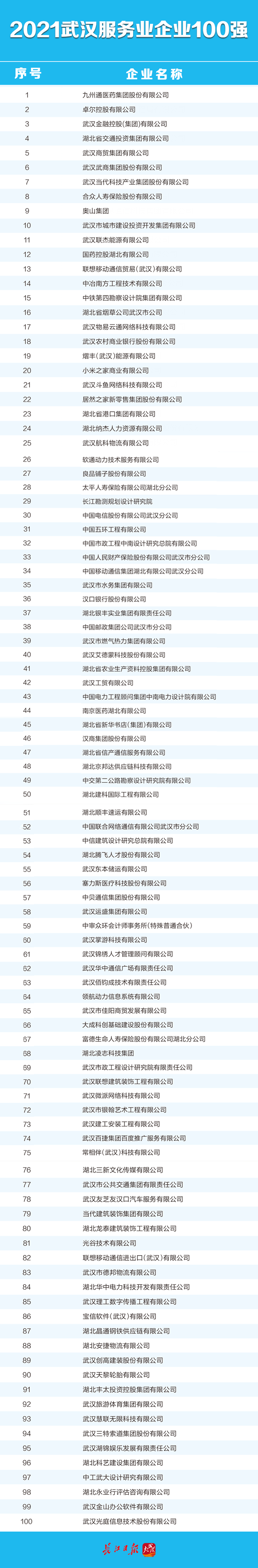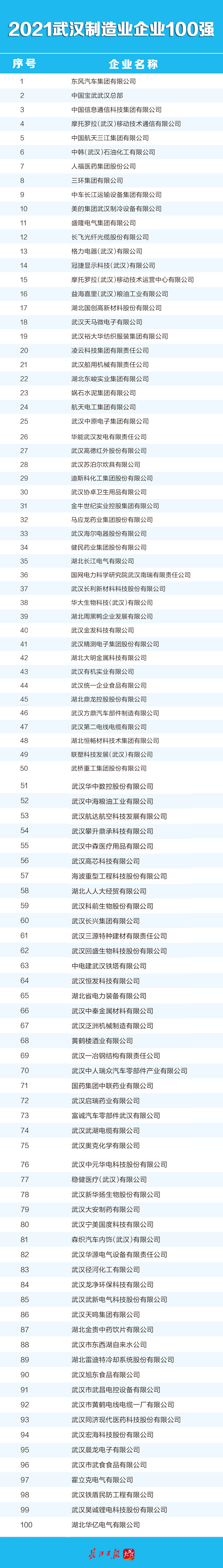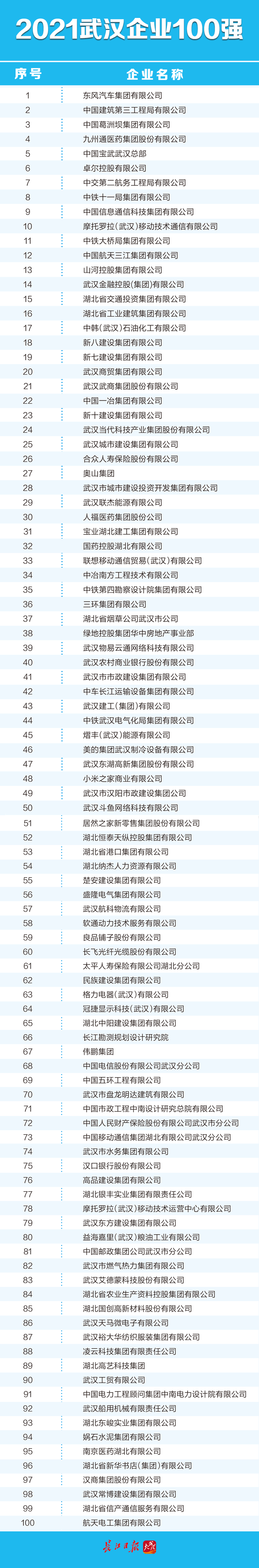 武汉企业100强是全市的领军企业,是武汉各行业的杰出代表,其变化趋势在一定程度上反映了全市经济发展的走势。武汉企业联合会、武汉企业家协会、武汉发展战略研究院按照国际通行做法,遵循企业自愿申报原则,依据申报企业2020年度营业收入,排出了涵盖各种所有制及行业的综合性2021武汉企业100强榜单(综合百强)、武汉制造业企业100强榜单(制造业百强)和武汉服务业企业100强榜单(服务业百强),并联合长江日报报业集团、武汉广播电视台向社会公布。
