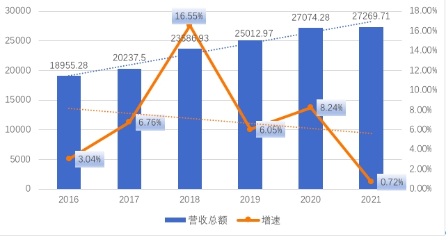 2016-2021武汉企业100强营收总额情况。
