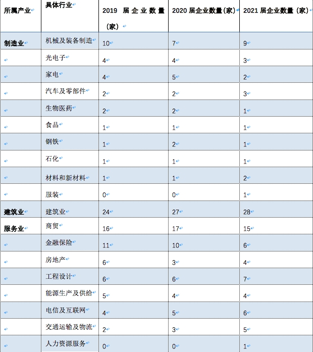 2019、2020、2021武汉企业100强具体行业分布情况。