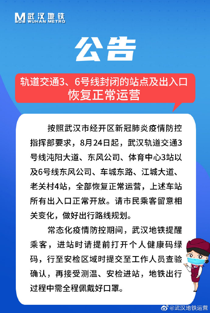 按照武汉市经开区新冠肺炎疫情防控指挥部要求,8月24日起,武汉轨道交通3号线沌阳大道、东风公司、体育中心3站以及6号线东风公司、车城东路、江城大道、老关村4站,全部恢复正常运营,上述车站所有出入口正常开放。请市民乘客留意相关变化,做好出行路线规划。