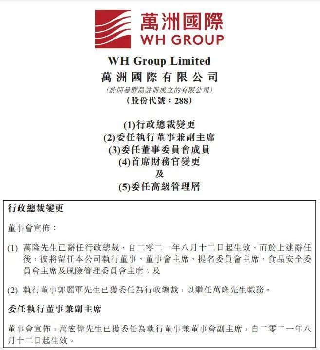 近日,双汇食品的母公司万洲国际发公告称,免去双汇创始人万隆之子万洪建包括执行董事、董事会副主席、副总裁等在内的所有职务。有网友表示,在接班这件事上,未必非得儿子。