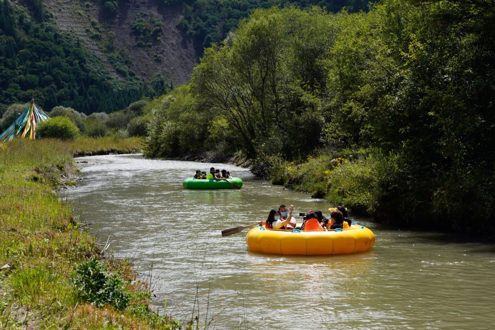 ↑8月24日,游客在九寨沟爱情海景区漂流。