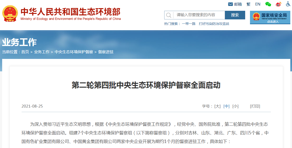 据生态环境部网站消息,生态环境部25日发布,第二轮第四批中央生态环境保护督察将全面启动,组建7个中央生态环境保护督察组,分别对吉林、山东、湖北、广东、四川5个省,中国有色矿业集团有限公司、中国黄金集团有限公司两家中央企业开展为期约1个月的督察进驻工作。