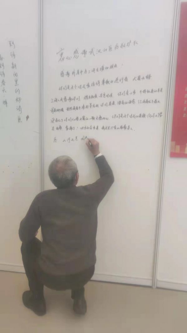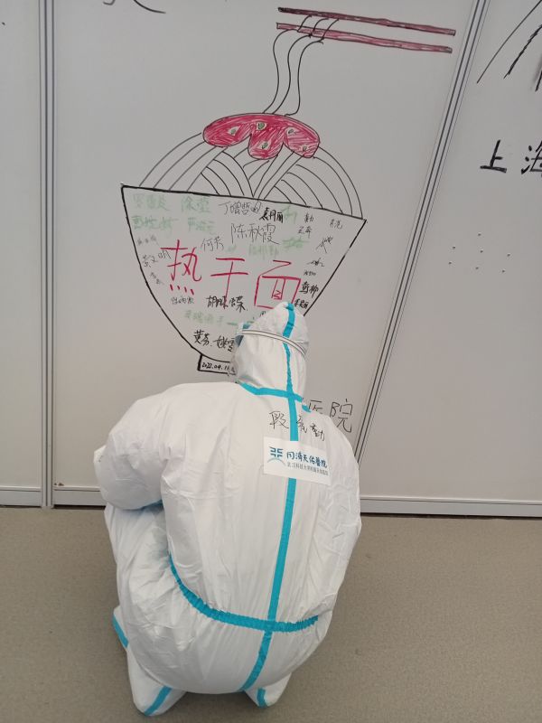 “原本想把简单的饮食科普画在隔板上,后来又想画些武汉的特色介绍给上海朋友,再后来患者们也加入画展,还有患者写下感谢信,让我们非常感动。”在小组长丁增哲带领下,她的组员段雅勤、胡晓蝶等人纷纷加入。“除了带患者做一些康复训练,还要注意他们心理健康,我们互相为对方祝福。”
