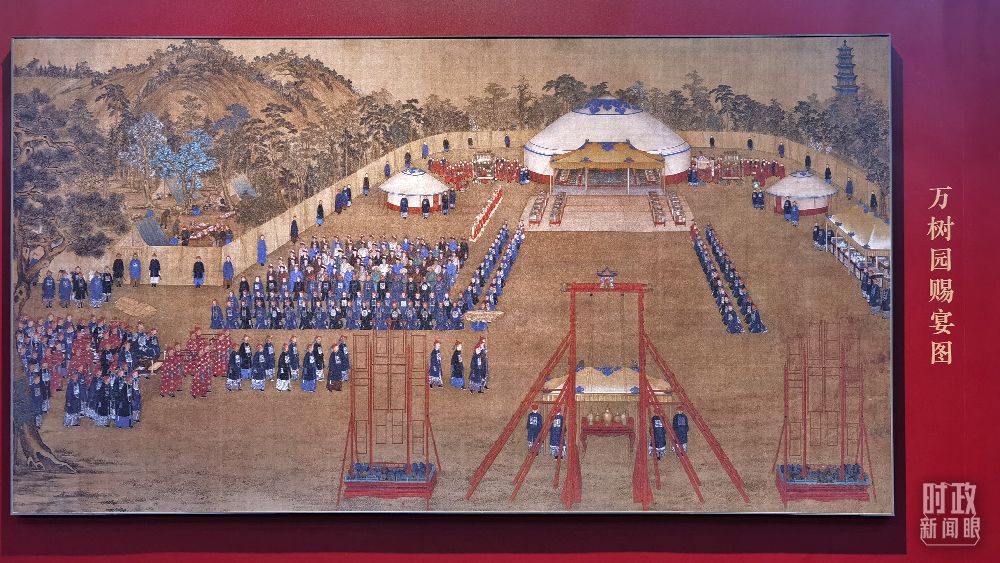 承德博物馆展出的《万树园赐宴图》。避暑山庄万树园内有28座蒙古包,乾隆皇帝曾在这里接见蒙古土尔扈特部渥巴锡汗、六世班禅。总台央视记者马立飞 摄