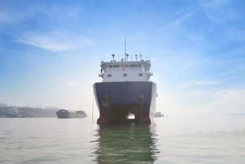 据了解,我国双体船目前仅有普通客轮和货轮,“交发天龙”轮是我国第一艘双体集装箱船。该船由湖北天龙高速船业有限公司研发设计、宜昌鑫汇船舶修造有限公司制造。