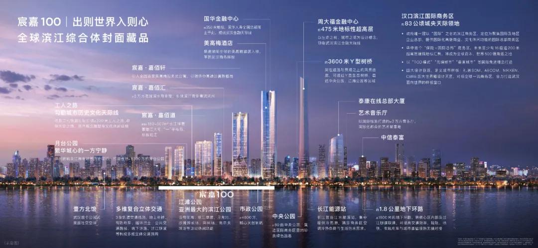 宸嘉100位于汉口滨江国际商务区二七核心片,核心片面积仅83公顷、沿江面长度约1.4公里,以周大福金融中心为起点向两边延伸