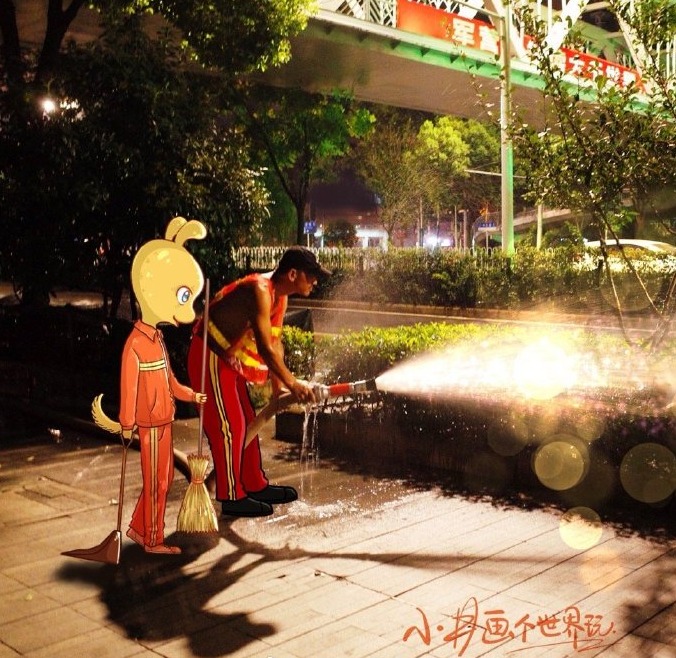 “小精灵”深夜帮助环卫工人做清洁。小井创作