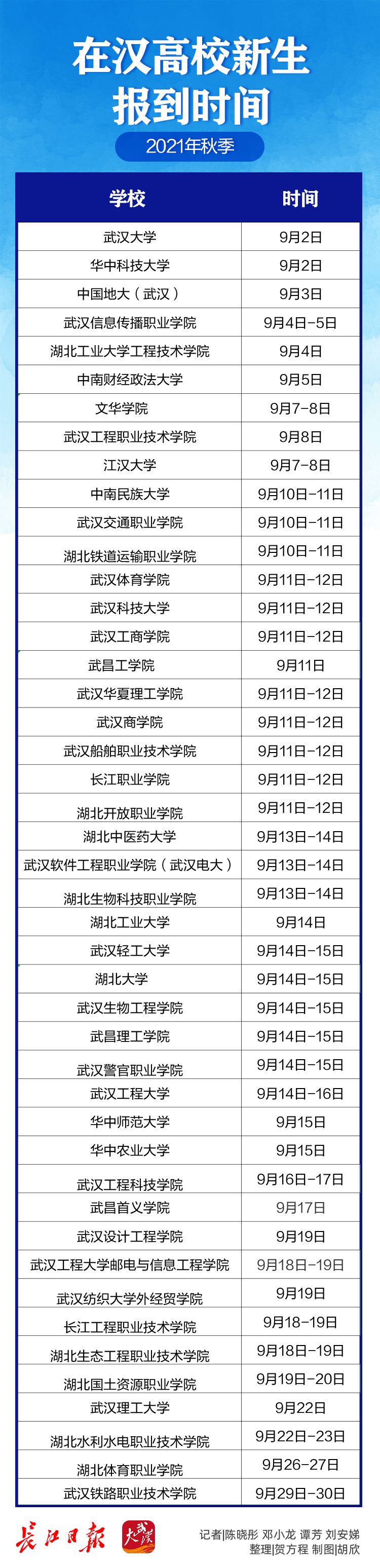 9月中旬将是今年新生报到最集中的时间段。9月11日至13日,中南民族大学、武汉科技大学、武汉体育学院、湖北中医药大学等15所高校新生报到;9月14日至17日,华中师范大学、华中农业大学、湖北大学、湖北工业大学等11所高校新生报到。