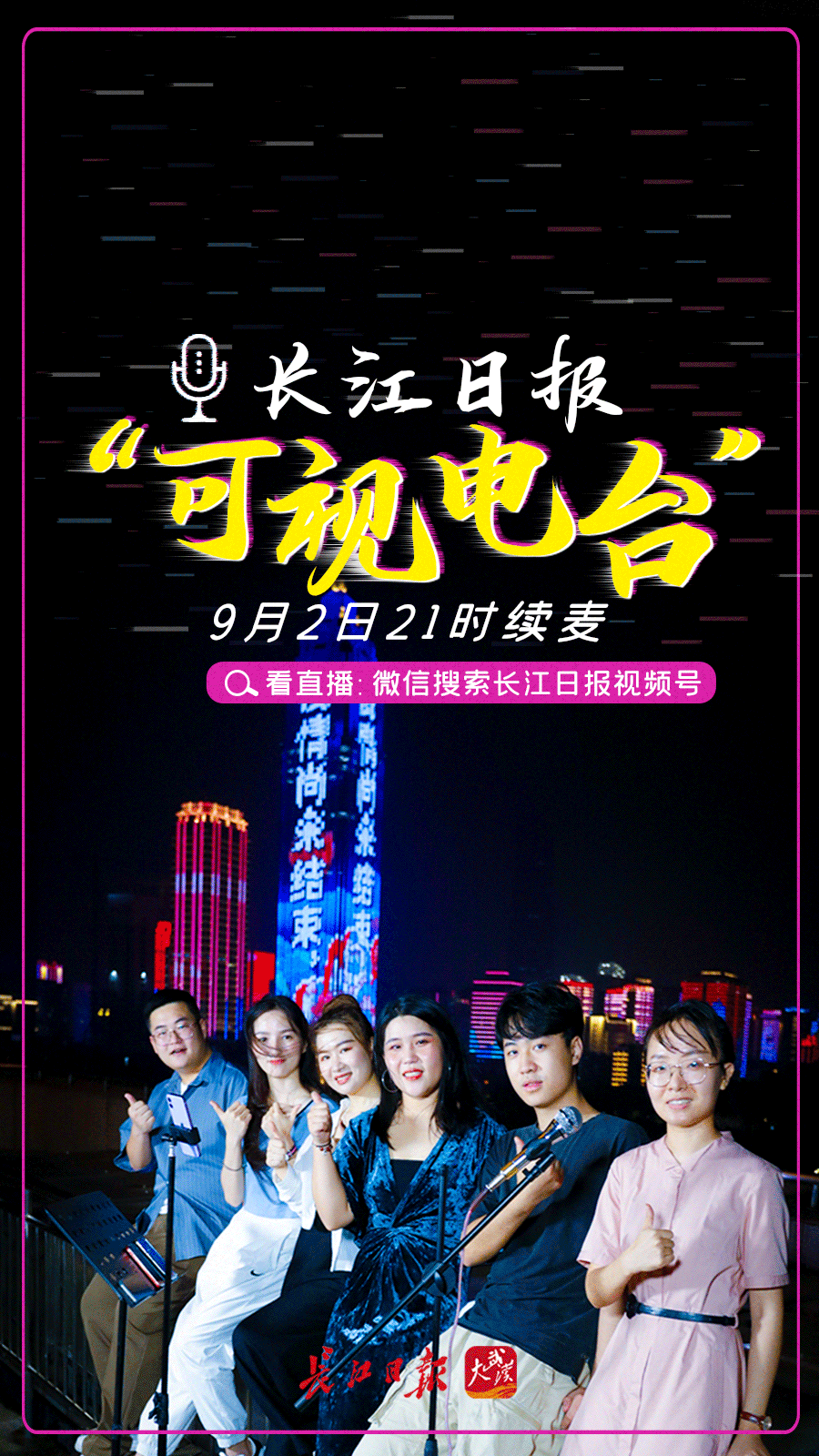 长江日报大武汉客户端9月2日讯 夜幕低垂,灯光秀开启,两江四岸霓虹闪烁。9月2日晚,长江日报“可视电台”在汉口江滩横渡长江博物馆顶楼继续开麦,这是“可视电台”开播的第三天,不仅有武汉人在现场表达对武汉的热爱,还有拖家带口的音乐爱好者、洋溢着青春气息的格力员工组团来直播,他们用歌声表达着对生活的热爱,畅想未来。