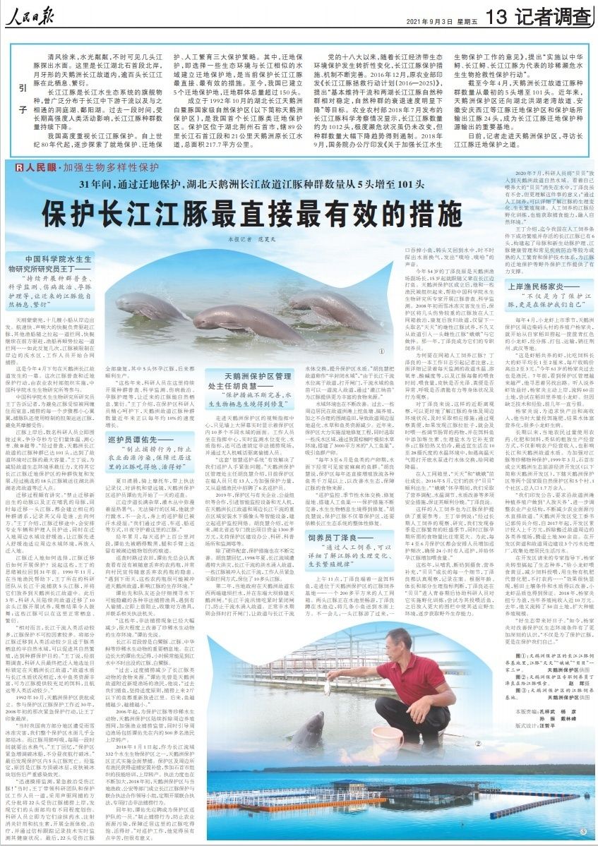“持续开展种群普查、科学监测、伤病救治、孕豚护理等,让迁来的江豚能自然栖息、繁衍”