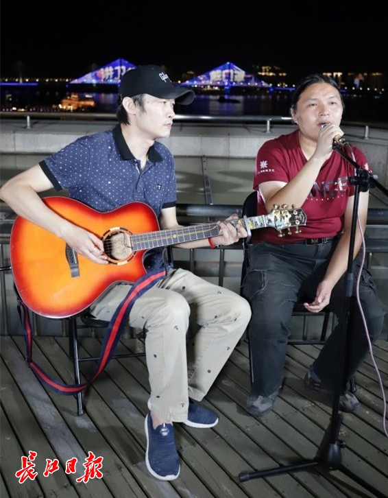 “90后”胖胖是“可视电台”电台的粉丝,他来到现场演唱《十年》《女孩》等歌曲。他深情地演唱,吸引吉他手余永黎的注意。余永黎1994年加入武汉最早的地下乐队the comrades任主音吉他手,他现场提议让胖胖和主播土土担任歌手,自己亲自为他们进行伴奏。不一会,《小幸运》《新不了情》现场真人伴奏live版精彩呈现。胖胖说:“有了吉他伴奏的加入,真是太棒了,在这样美的江边一起唱歌,很舒服。”