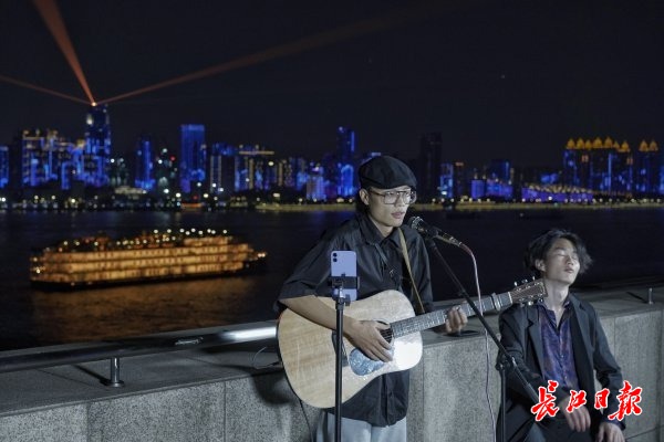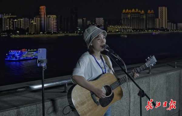 长江日报大武汉客户端9月7日讯(记者范雅琴 徐佳)以长江风光为幕布,一群热爱音乐的人带来一首首动人心弦的歌曲,远处不时传来汽笛的声音,让人感到武汉的秋夜恬静又美好。9月7日晚,长江日报“可视电台”在汉口江滩横渡长江博物馆顶楼继续开麦,这是“可视电台”开播的第7天。现场热闹非凡,原创弹唱女歌手“青豆”、武汉独立唱作人仲立、年轻歌手王俊杰、“95后”音乐博主“甲鱼”,以及音乐爱好者丁洪博、黄程程纷纷拿出看家本领。网友刷屏点赞,留言互动,不亦乐乎。