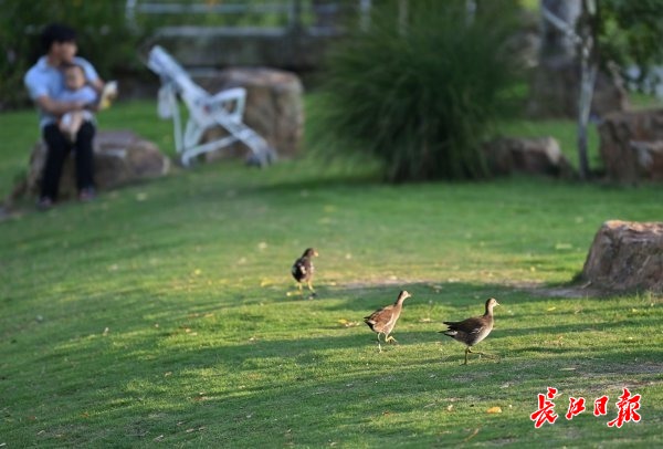 长江日报大武汉客户端9月7日讯 9月7日傍晚,西北湖边,一群黑水鸡淡定走过草地、穿过步道、钻入湖水,在夕阳下追逐嬉戏。