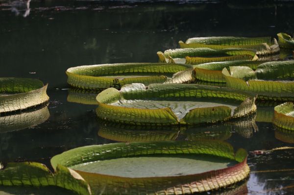即便花谢,巨大如盆的王莲叶片也极具观赏性。王莲是水生有花植物中叶片最大的植物,有“水上花王”的美誉。王莲的叶子背面布满了由中心向四周放射状的粗壮叶脉,叶脉内部具有特别发达的通气组织,里面储藏大量空气。这使得每片叶子浮于水面,可承重数十公斤。目前植物园内最大的王莲叶片直径已达到2.1米,令人咋舌。