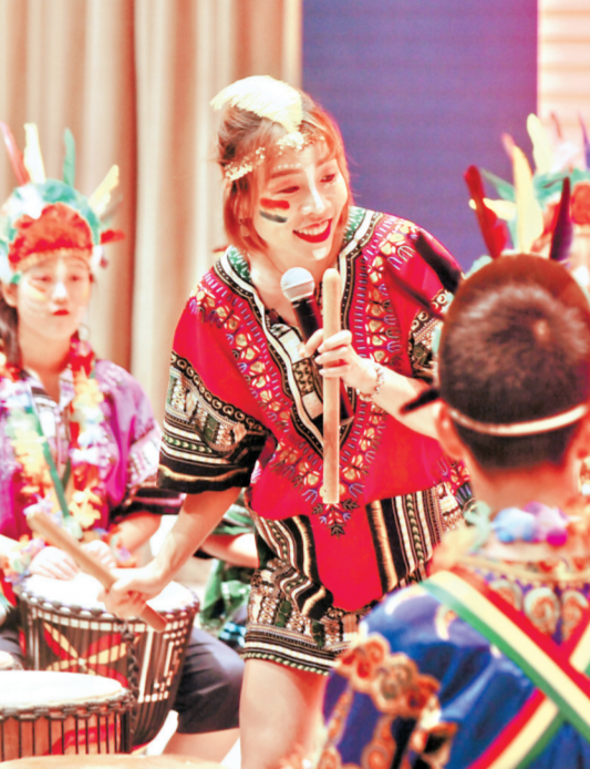 红领巾实验学校音乐老师刘心悦(中)跟学生合奏。
