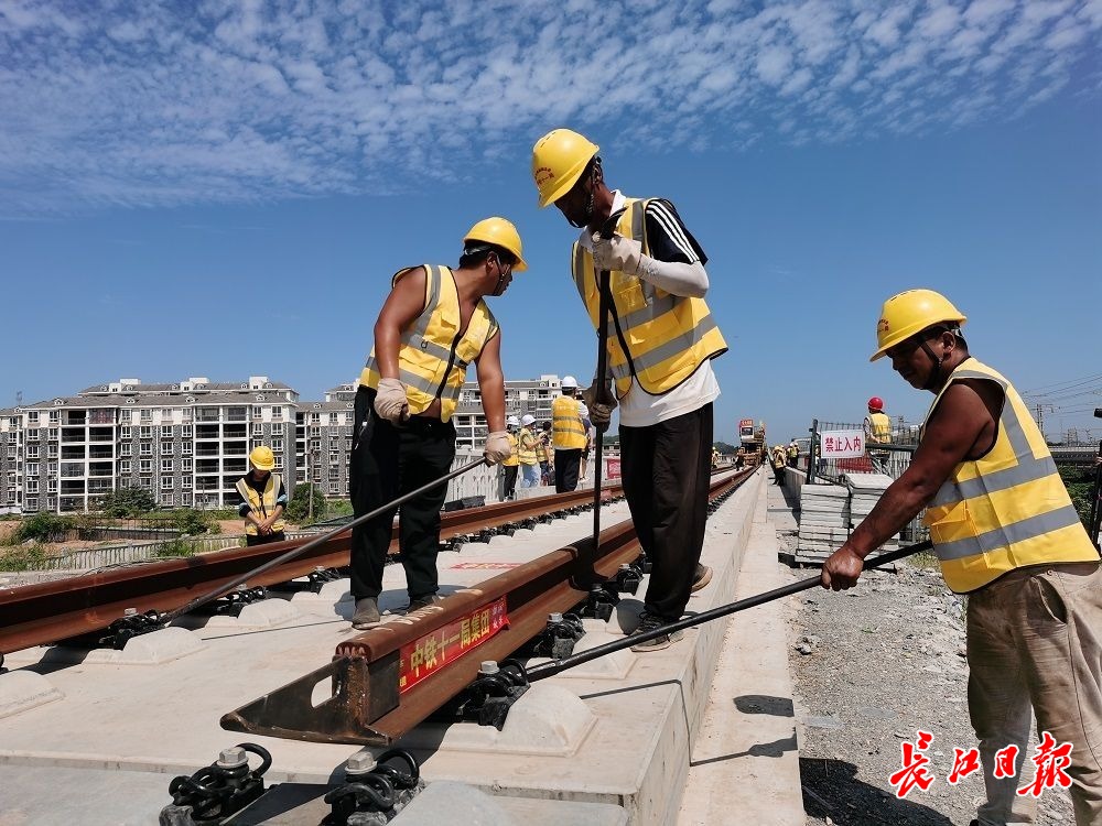 建设者铺设安九高铁最后一段长轨。通讯员马晓兰 摄