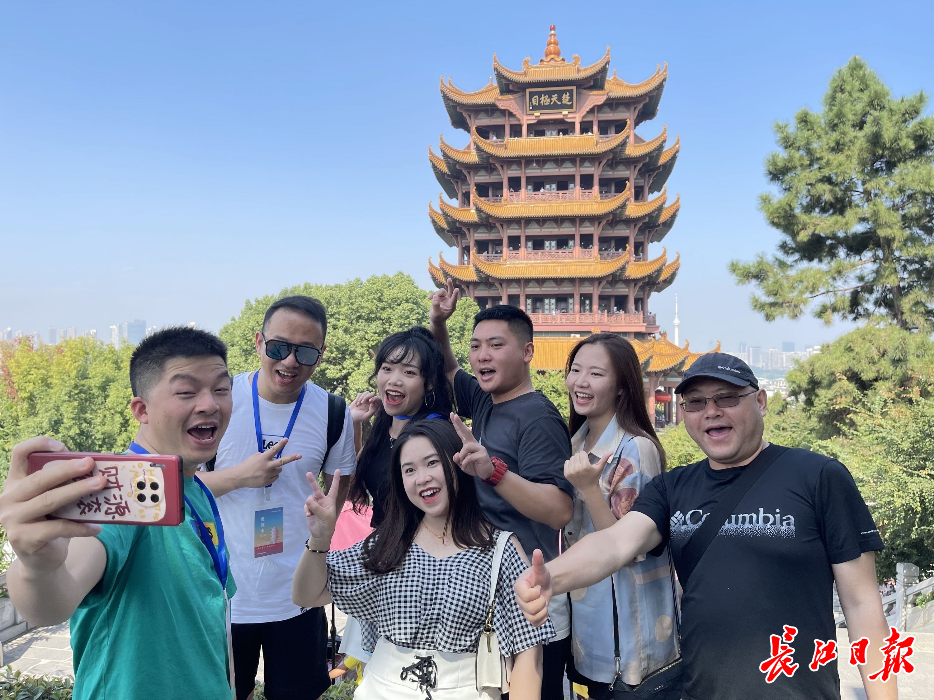 来自贵阳的旅行团在黄鹤楼前留影。记者何晓刚 摄