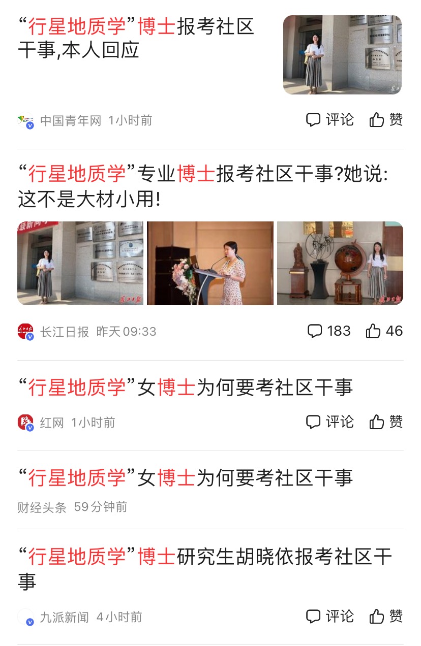 “行星地质学女博士胡晓依报考社区干事”引发“大材小用”热议
