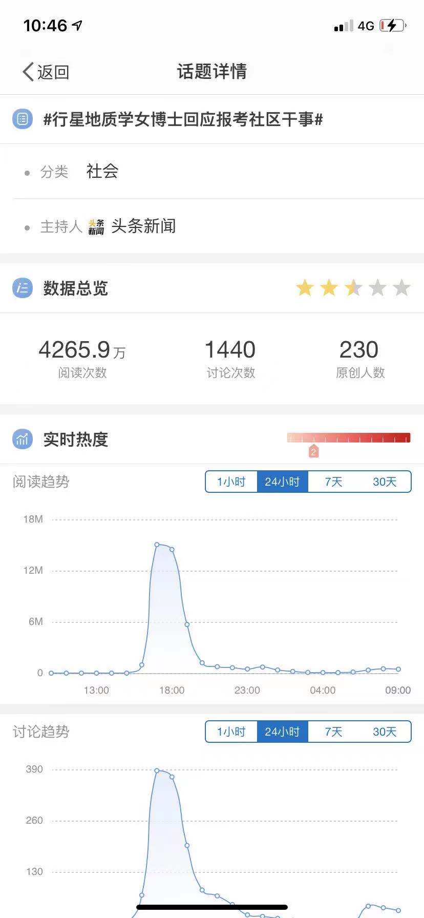 网上关于“行星地质学女博士胡晓依报考社区干事”的关注热度。 长江日报见习记者郝天骄翻拍